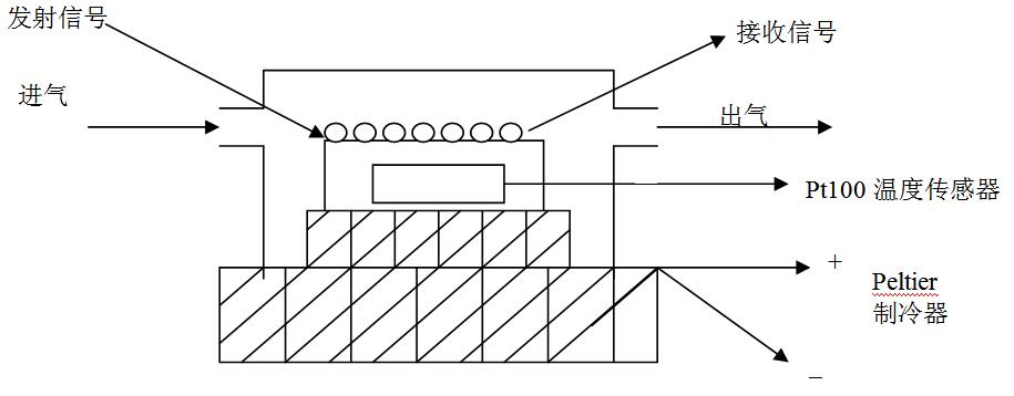 如圖1所示,氣體通過(guò)露點(diǎn)測(cè)量室時(shí)掠過(guò)露層傳感器。當(dāng)露層傳感器溫度高于該氣體的露點(diǎn)溫度時(shí),露層傳感器呈干燥狀態(tài),此時(shí),通過(guò)露層傳感器的發(fā)射信號(hào)和接收信號(hào),經(jīng)控制回路比較、放大,驅(qū)動(dòng)熱電制冷器(由一級(jí)或數(shù)級(jí)Peltier元件組成),對(duì)露層傳感器制冷;當(dāng)露層傳感器溫度降至樣氣的露點(diǎn)溫度以下時(shí),露層傳感器上開始結(jié)露(或霜),這時(shí)接收器采集的信號(hào)產(chǎn)生變化,此變化經(jīng)控制回路比較、放大后調(diào)節(jié)熱電制冷器激勵(lì),使其制冷功率減小,zui后,露層傳感器溫度保持在樣氣的露點(diǎn)溫度上。