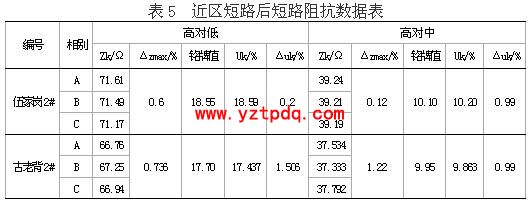 3) 2004年12月8日,雨天,10KV黃磷二回古21開關(guān)因線路接地,產(chǎn)生過電壓,導致10KV母線短路,古老背2#主變差動速斷動作,2#主變?nèi)齻?cè)開關(guān)跳閘。當天我們進行了繞組變形試驗,通過與歷史曲線對比,我們發(fā)現(xiàn)中低壓側(cè)頻響曲線一致性相當好,但高壓繞組A相高頻段相關(guān)系數(shù)為1.33,分析頻響圖譜發(fā)現(xiàn)相關(guān)系數(shù)不好的原因不是波峰波谷的變化,而是A相繞組在2K頻率下幅值比歷史曲線低。短路阻抗測試結(jié)果顯示高壓對低壓三相繞組電抗值相差僅0.736%,高壓對低壓繞組短路阻抗與銘牌值相比,相差1.506%,高壓對中壓短路阻抗值與銘牌值相差0.99%,見表5。直流電阻測量也顯示無匝間或?qū)娱g短路。該變壓器原為無載調(diào)壓變壓器,在城網(wǎng)改造中進行過無載改有載改造,將高壓中性點解開,拆分為X、Y、Z后外加三只套管引出,通過三根跳線引至調(diào)壓變壓器。試驗時因雨未將架空線與X、Y、Z三只套管解開,而是直接將架空線與調(diào)壓變的聯(lián)結(jié)解開,這樣A 相繞組尾端末懸空并連有約2m長的跳線。2K頻率下繞組響應(yīng)幅值比歷史曲線下降的原因在于引線未拆除。 引線感應(yīng)電壓的影響(1#主變?nèi)栽谶\行,相距約4米)、引線與高壓A相套管的接觸不良均會造成此現(xiàn)象發(fā)生。因此我們下出高壓繞組A相無變形的結(jié)論,目前該變壓器一直安全運行。