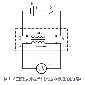 變壓器的極性通常采用直流法來確定。如圖1-2所示,測量時,用一個電池,將其”+“極接于變壓器一次繞組A端,”-“級接于X端;將毫安級電流表或伏安級電壓表”+“端接于二次繞組的a端,”-“端接于x端。接好線后,若將開關S合上時,毫安表向正向偏轉,而拉開開關S時指針指向負方向偏轉,則說明變壓器繞組A 、a端同極性。如指針擺動與上述相反,說明變壓器繞組A 、a端極性相反,變壓器加極性。