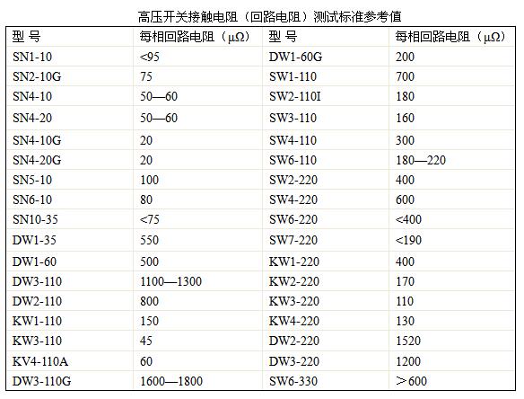 各型號高壓開關(guān)回路電阻測試標準參考值