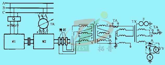 其同步發(fā)電機(jī)組基本原理接線如上圖所示。圖中,電源裝置同補(bǔ)償電抗器、中間升壓變壓器以及必要的外圍測量設(shè)備聯(lián)合使用。電源主要由三相異步電動機(jī)和無刷勵磁的中頻同步發(fā)電機(jī)組成中頻發(fā)電機(jī)組,再配以啟動、控制、測量和保護(hù)系統(tǒng)組成。其工作原理為中頻發(fā)電機(jī)發(fā)出定頻率(150Hz)的單相或三相交流電能,經(jīng)中間變壓器升壓,同時用補(bǔ)償電抗器來調(diào)整補(bǔ)償被試變壓器的電容性電流,以獲得所需的試驗電壓。這種工作原理和方式可以得到所需頻率的試驗電壓,電網(wǎng)電源僅用來驅(qū)動發(fā)電機(jī)組和提供直流勵磁電源,使試驗電源與電網(wǎng)電源實現(xiàn)隔離,從而消除了試驗回路來自電網(wǎng)系統(tǒng)的干擾,無刷勵磁方式也大大降低了電源本身的干擾水平,因此在做感應(yīng)耐壓的同時,也可進(jìn)行局部放電測量。