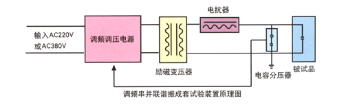 通過調(diào)頻控制器提供供電電源,試驗(yàn)電壓由勵(lì)磁變壓器經(jīng)過初步升壓后,使高電壓加在電抗器L和被試品C上,通過改變調(diào)頻控制器的輸出頻率,使回路處于串聯(lián)諧振狀態(tài)?;芈返闹C振頻率取決于被試品電容C和電抗器的電感L,調(diào)節(jié)變頻控制器的輸出電壓,使試品上高壓達(dá)到所需要的電壓值。