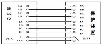 假設(shè):低電壓閉鎖定值為60V(指線電壓),過電流定值為5A。將測試儀的UA、UB、UC、UN;IA、IB、IC和IN分別接入變壓器后備保護(hù)的交流輸入端,同時(shí)將保護(hù)出口跳閘接點(diǎn),接入測試儀的開關(guān)量輸入端1,設(shè)置IA=6A,IB=IC=0,UA=UB=UC=57V,相位互差120度。選擇UA、UB和UC同時(shí)可變,60/1.732=34.64,用【手動(dòng)試驗(yàn)】方式同時(shí)遞減三相電壓,當(dāng)UA=UB=UC=34.64V時(shí),保護(hù)動(dòng)作。
