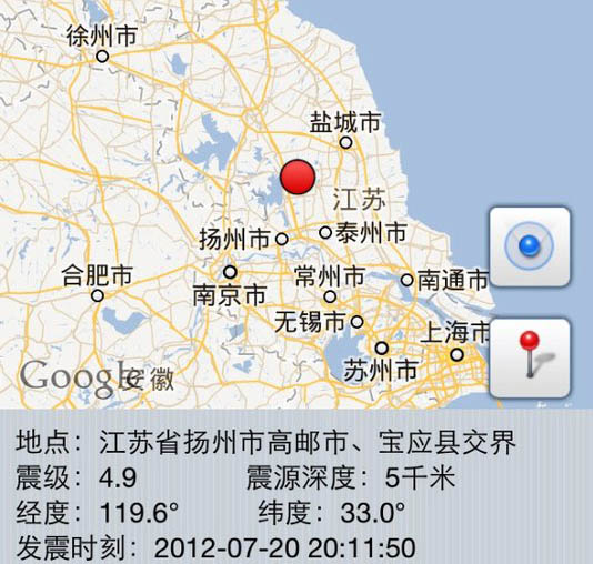 據(jù)揚州市地震臺網(wǎng)中心測定,2012年7月20日20時11分在揚州高郵、寶應交界(北緯33.0度,東經(jīng)119.6度)發(fā)生4.9級地震。