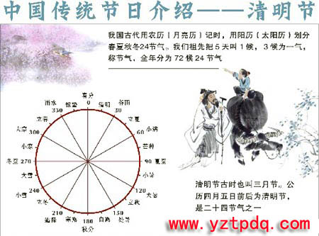 中華民族的傳統(tǒng)節(jié)日-清明節(jié)大約始于周代,已有二千五百多年的歷史。清明最開始是一個(gè)很重要的節(jié)氣,清明一到,氣溫升高,正是春耕春種的大好時(shí)節(jié),故有“清明前后,種瓜種豆”。“植樹造林,莫過清明”的農(nóng)諺。后來,由于清明與寒食的日子接近,而寒食是民間禁火掃墓的日子,漸漸的,寒食與清明就合二為一了,而寒食既成為清明的別稱,也變成為清明時(shí)節(jié)的一個(gè)習(xí)俗,清明之日不動(dòng)煙火,只吃涼的食品。