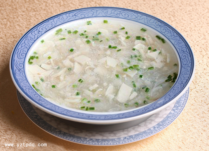 “雪花豆腐”菜名即珠湖雪浪。古代發(fā)明豆腐的是淮南王劉安,關(guān)于淮南王做豆腐的傳說(shuō)很多:一說(shuō)劉安在安徽淮南八公山上用大豆煉丹,偶然發(fā)現(xiàn)豆?jié){的凝固現(xiàn)象,逐漸試做出豆腐,在禪內(nèi)秘食,淮南王善于游禪交僧,一日嘗到了和尚們做的豆腐頓覺(jué)品味素新,便將豆腐的做法推廣到民間,相傳到各地;還有一說(shuō):淮南王劉安非常孝順父母,其母喜吃黃豆,漢高祖十一年時(shí),淮南王的母親生了病,劉安主人把她平時(shí)愛(ài)吃的黃豆磨成粉,用水沖著喝,并為了調(diào)味放入了一些鹽,結(jié)果就是出現(xiàn)了蛋白質(zhì)凝集的現(xiàn)象,劉安的母親吃了很高興,病也是很快好了,于是鹽鹵點(diǎn)豆腐的技術(shù)便流傳下來(lái)。而首創(chuàng)“雪花豆腐”的是揚(yáng)州高郵人,所以高郵的“雪花豆腐”風(fēng)味獨(dú)特。加工切成的豆腐塊細(xì)如飛雪,如珠湖之浪花,它鮮美、香甜、細(xì)嫩、光滑、舒適、暖胃,食后回味留連,越吃越想吃。藝術(shù)大師劉海粟曾為其題詞:“其味無(wú)窮”。