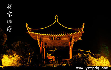 如今,在城中心的縱棹園里。進(jìn)了素磚、高瓦的園門,走過垂柳依依的石路,踏上溪流涓涓的小橋,那飛檐翹角、凌然欲飛的八寶亭就躍人了你的眼簾。遠(yuǎn)遠(yuǎn)地,趙樸初先生書寫的餾金大字“八寶亭”赫然醒目,映射出寶應(yīng)唐代繁華歷史。